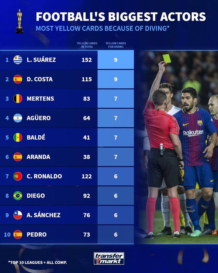 世界杯手机官网直播软件下载官方入口-德转列前10联赛假摔染黄次数榜:苏牙&科斯塔9黄第一,C罗6黄上榜